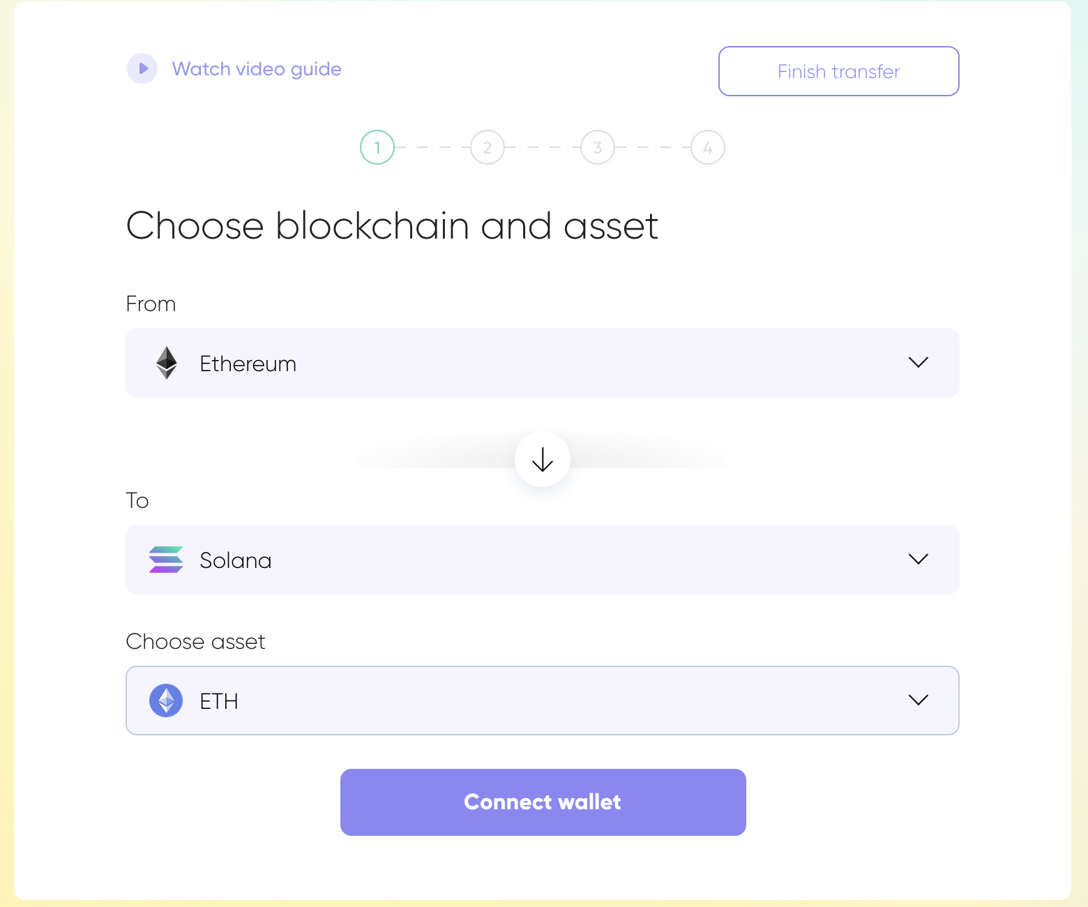 First, head to the Allbridge token bridge and select Ethereum as the source blockchain and Solana as the destination. Make sure you have enough ETH and SOL in both wallets to pay for transactions on both blockchains. Select which asset you'd like to bridge (we'll use ETH) and connect your Ethereum wallet.